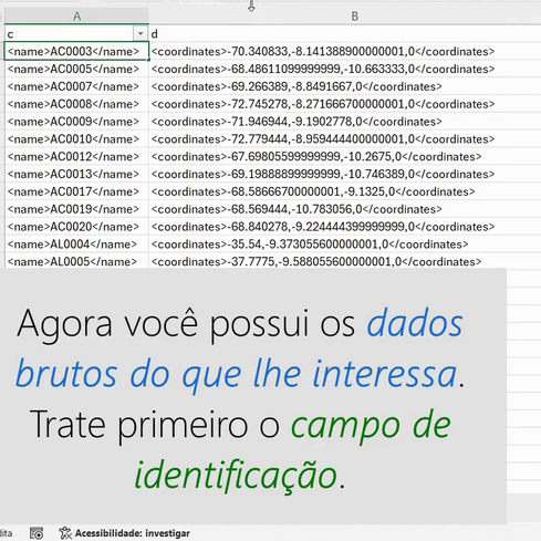Abra o Excel e clique em uma célula vazia, depois cole o texto (Ctrl+V). No Excel, organize as colunas e encontre aquelas onde as tags <name> e <coordinates> aparecem. A tag <name> conterá a identificação do ponto, e a tag <coordinates> suas respectivas coordenadas. Neste exemplo, elas estavam nas colunas D e E, respectivamente.